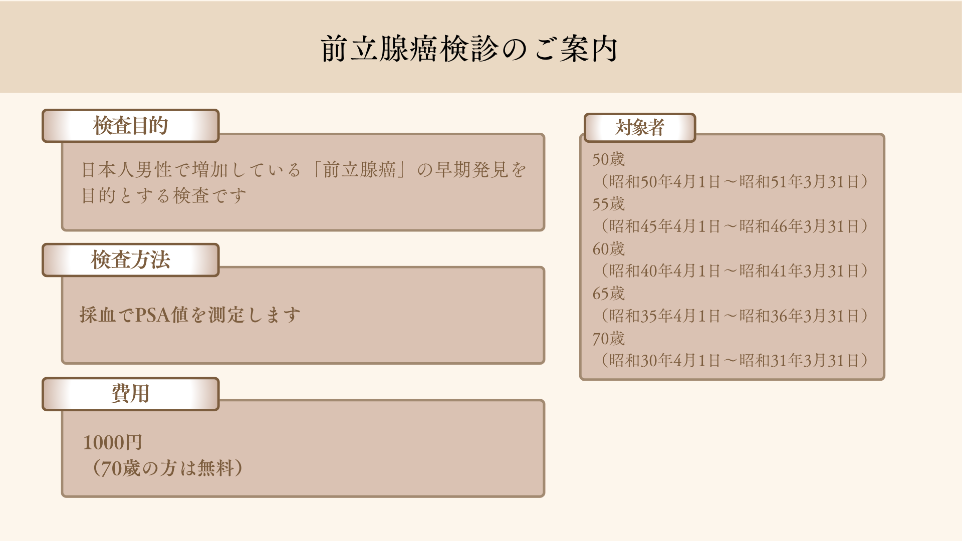対象年齢の方は、ぜひこの機会に前立腺がん検診(PSA検査)をご利用ください。