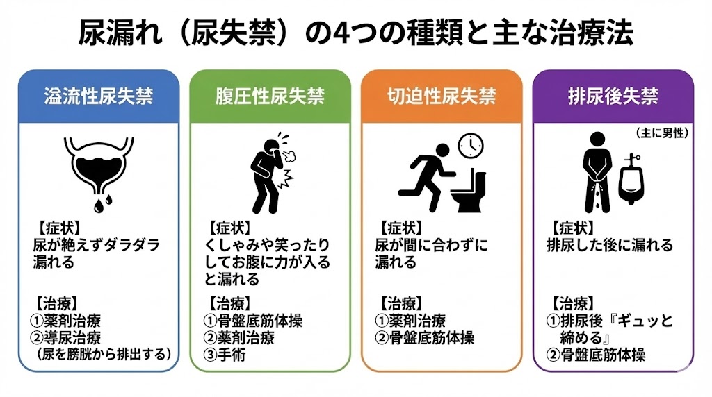 - 尿漏れは4つのタイプ(溢流性・腹圧性・切迫性・排尿後尿滴下)に分かれ、原因・対処法が異なります。